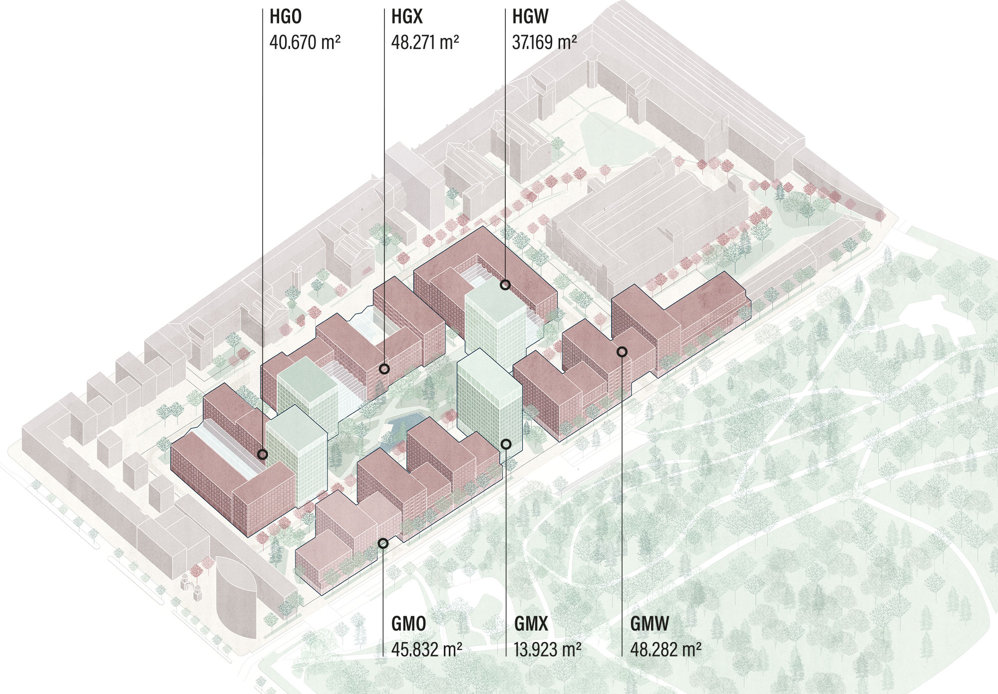 It envisions a composition of six building sections, mostly five to eight stories high, along with four high-rise landmarks arranged around a central neighborhood park. On the site, which has so far been closed to the public, a modern, architecturally sophisticated, innovative, and sustainable district with high functionality and flexibility is to be created following the demolition of the existing building.
