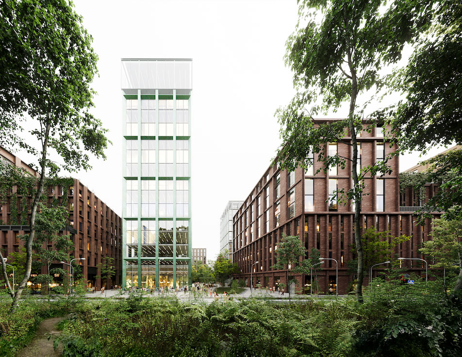 Er sieht eine Bebauung mit sechs überwiegend 5 bis 8-geschossigen Gebäudeteilen und vier Hochpunkten rund um einen zentralen Quartierspark vor. Auf dem bislang für die Öffentlichkeit geschlossenen Grundstück soll nach dem Rückbau des Bestandsgebäudes, ein modernes, architektonisch hochwertiges, innovatives und nachhaltiges Quartier mit einer hohen Funktionalität und Flexibilität entstehen.